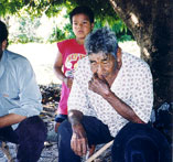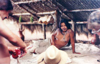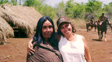 Então, houve vários momentos, já na filmagem, em que fiquei desesperada porque eu olhava os índios realizando uma cena escrita no roteiro a partir da pesquisa e via que era falsa. Ou seja, o nosso filtro branco tinha prevalecido. Acho um exemplo muito claro disso a cena da ida para a cachoeira, que acabou sendo cortada. Era uma seqüência que mostrava um grupo de jovens da aldeia indo para uma cachoeira. Quando eu fui filmar, qual era a minha experiência de ir para uma cachoeira? Era ir para a praia de Ipanema...então, eu olhava para as moças, olhava para o que estava sendo feito, e a sensação que eu tinha é que elas estavam caminhando para a praia de Ipanema....Essa descoberta do falso, essa descoberta da existência do meu filtro e de como tentar uma coisa de mais veracidade foi o grande desafio desse filme. E eu acho que se nós conseguimos, foi, é claro, por um esforço muito grande nosso, mas fundamentalmente pela grande colaboração de alguns dos índios, como a D. Aracy e o Hilário Silva, que conseguiam fazer a ponte entre as duas culturas.