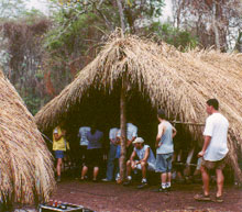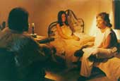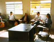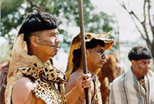 Então, caminhamos num caminho contrário ao padrão holywoodiano e de uma estrutura tradicional de um filme de ficção. Ao invés de procurar brancos com biotipo indígena para fazer o elenco indígena, e gastarmos o nosso orçamento com produtores de elenco, linguistas, etc, nós investimos na pesquisa e no tratamento junto com os índios para que eles pudessem vir a se colocar no filme. Mas é claro também que, apesar toda a pesquisa, as definiç›es não se esgotaram no laboratório. Num certo sentido, a gente viveu durante a filmagem, no dia a dia, tudo aquilo que o filme discute, toda a dificuldade cultural desses dois mundos, dessas duas cabeças se encontrando. Acho que a grande dificuldade do filme foi trabalhar uma ficção que ao mesmo tempo tentasse esse diálogo com a cultura indígena. Então, na filmagem, por mais que o roteiro tivesse sido feito a partir de informaç›es dadas pelos próprios índios, ele tinha sido trabalhado por um filtro branco meu e das pessoas que colaboraram neste trabalho. (Sérgio Flaksman, Luiz Eduardo Vidal e os consultores do Sundance Institute)